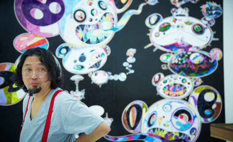 Takashi Murakami is feeling sleepy but jubilant. It’s a brilliant fall day in New York City and the Tokyo-based artist is rubbing his eyes in the sunlit Gagosian Gallery on West 24th Street. Murakami, who is often called the Andy Warhol of the East and has collaborated with the likes of Marc Jacobs for Louis Vuitton, Pharrell Williams and Kanye West, has spent the last three weeks installing “In the Land of the Dead, Stepping on the Tail of a Rainbow.” He comes off casual, wearing a camo-print long-sleeve shirt, a green Patagonia down vest, loose tan trousers, his signature man bun and an easy smile. His new works though, “a culmination of his decade-long study and research of the Japanese art renaissance,” he says, are anything but.
