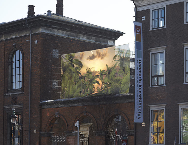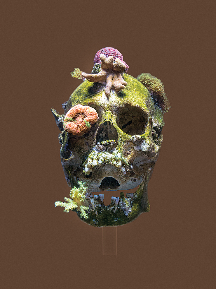 As a result, he’s been moving away from capturing images of the natural world to recreating experiences of it. The works—some permanent, some ephemeral, many of which are actually alive—show the fragility of our relationship to nature in this over-mediated, hyper-connected world. They include guided boat tours of the Danube River, Icelandic fjords or the East River with friends which he records with line drawings; simulated environments of Antarctic adventures complete with engine oil fragrances and refreezing mirrors; a photographed virtual reality rendering of Caspar David Friedrich’s iconic seascape, The Sea of Ice; billboards with photos of computer-generated sunset simulacra; or Nowhere to Be Found, a modernist fish tank (not unlike Jeff Koons’s One Ball Total Equilibrium Tank) filled with a human skull overgrown with coral that can feed off the bone calcium for two decades.