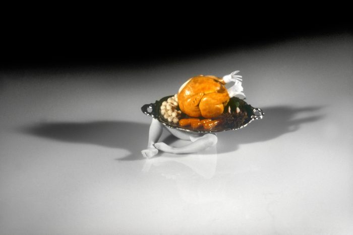 While she plans to make more time-based work, for now Simmons is back in the studio creating still images, splitting her time between New York and Connecticut. In recent years she’s shifted from photographing dolls and miniatures to people and objects at human scale, and this month she will show a new series at Salon 94—one that suggests crafting a narrative film has unwittingly seeped into her photographic process. “The way that I’m framing the show, in terms of what I’m putting in it, tells a story about 2017,” she says. It will include a discombobulated rainbow panorama of objects from 99-cent stores, as well as more positive, personal takeaways from the past year, including photos of friends both new and old and a shot of her dog. Mary Boone Gallery will simultaneously exhibit a collection of Simmons’s works from 1990 to 1994, including her 1991 Clothes Make the Man sculpture, never-before-seen Walking Objects and the 1994 series Café of The Inner Mind, in which thought bubbles appear above male dummies’ heads, revealing their internal musings on food, women and rear ends. They’re works that were timely then and remain so now, thanks to Simmons’s unflinching look at domesticity and gender roles from the ‘50s to present day.