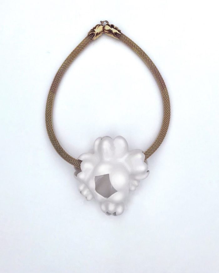 Me, too! Tell us about the pendant on this necklace. The necklace starts with the ceramics. I sculpted this design about four years ago; it was an element that went into my chandeliers and ceilings. These tufted Cloud fruits have been a recurring theme in my drawings, and one of my principle patterns. In my collage ceilings, we see the fruit change scale to becomes dots through a beautiful gradation. There’s a link to fruits and flowers to pure patterns.