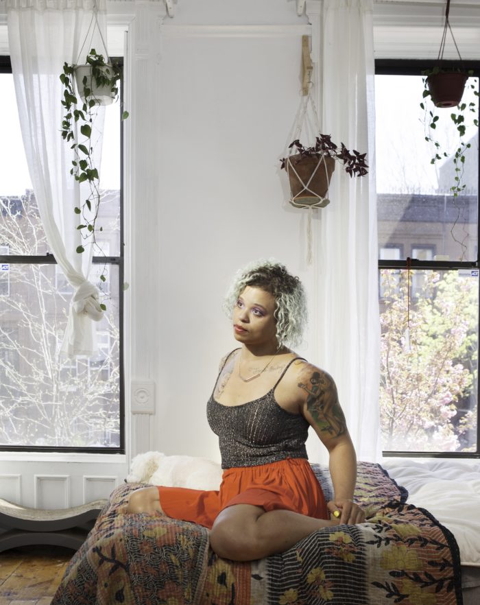 Earlier this year, several of Tourmaline’s projects came to fruition. “It feels like this magic moment of culmination,” Tourmaline says as we sit in her sun- bathed Brooklyn brownstone, an oasis of plants and lush DIY touches, such as a panel of pale pink satin covering the upstairs entry door and a fireplace mantle with the aura of an ancestor worship altar. One can feel the deep pleasure in Tourmaline’s words. She finally saw her years-in-the-making short film, Happy Birthday, Marsha!, co-directed with Sasha Wortzel, premiere at Outfest in Los Angeles this past spring after appearing in “Trigger: Gender as a Tool and a Weapon” at the New Museum this winter.