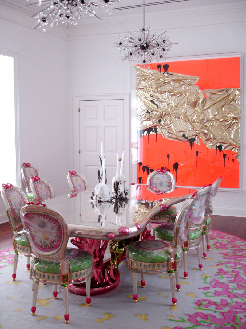 When I agreed to order edition number two of Abyss, Mattia decided to make unique chairs to go with the table. They are reproduction Louis XVI chairs. (Who knew that reproductions were more expensive then originals?) The needlepoint cushions are Mattia-designed and Aubusson-made. When they arrived I was blown away. Then I panicked. What would happen when my two-year-old boy spilled tomato sauce on the Aubusson needlework? I called Mattia in an agitated state. He told me not to worry, that he would get back to me with a solution. A few weeks later the phone rang and the solution arrived. Mattia decided to have the design of the chairs include plastic cover with gold edges. My Aubusson-Mattia Bonetti-Louis XVI reproduction chairs were to be covered in transparent plastic. Ta-da! No tomato sauce problem.
