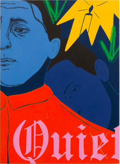 8. Gabriella Sanchez’s Quiet / Quit, 2018, $4,800 Sanchez, born and based in LA, paints vibrant collages of seemingly disparate references. The symbols floating across the canvas can be as innocuous as flowers and street lamps, and as literary as allusions to Oscar Wilde; they also touch on dualities of identity, including Mexican and American, us versus them. In the ambiguity of their meaning, they function almost like a Rorschach test: what you make of them says more about yourself than about the artist.
