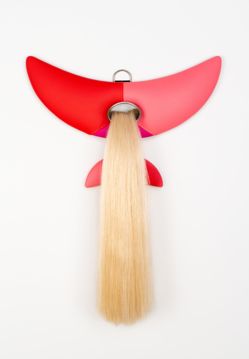 4. Trish Tillman’s Nightglow, 2019, $3,500 Tillman’s sculptures look strikingly familiar, like ancient suits of armor or tribal masks flattened and mounted to the wall. The works’ very contemporary air comes from her use of neon-colored vinyls, allusions to body piercings and chains and the occasional mane of blond hair, seen here almost as a provocation—almost like a pointed tongue from a pair of red lips.