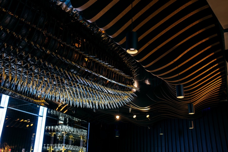 An installation of golden knives evokes the form of a sea urchin at Kaido. Photo by Juan Fernando Ayora.