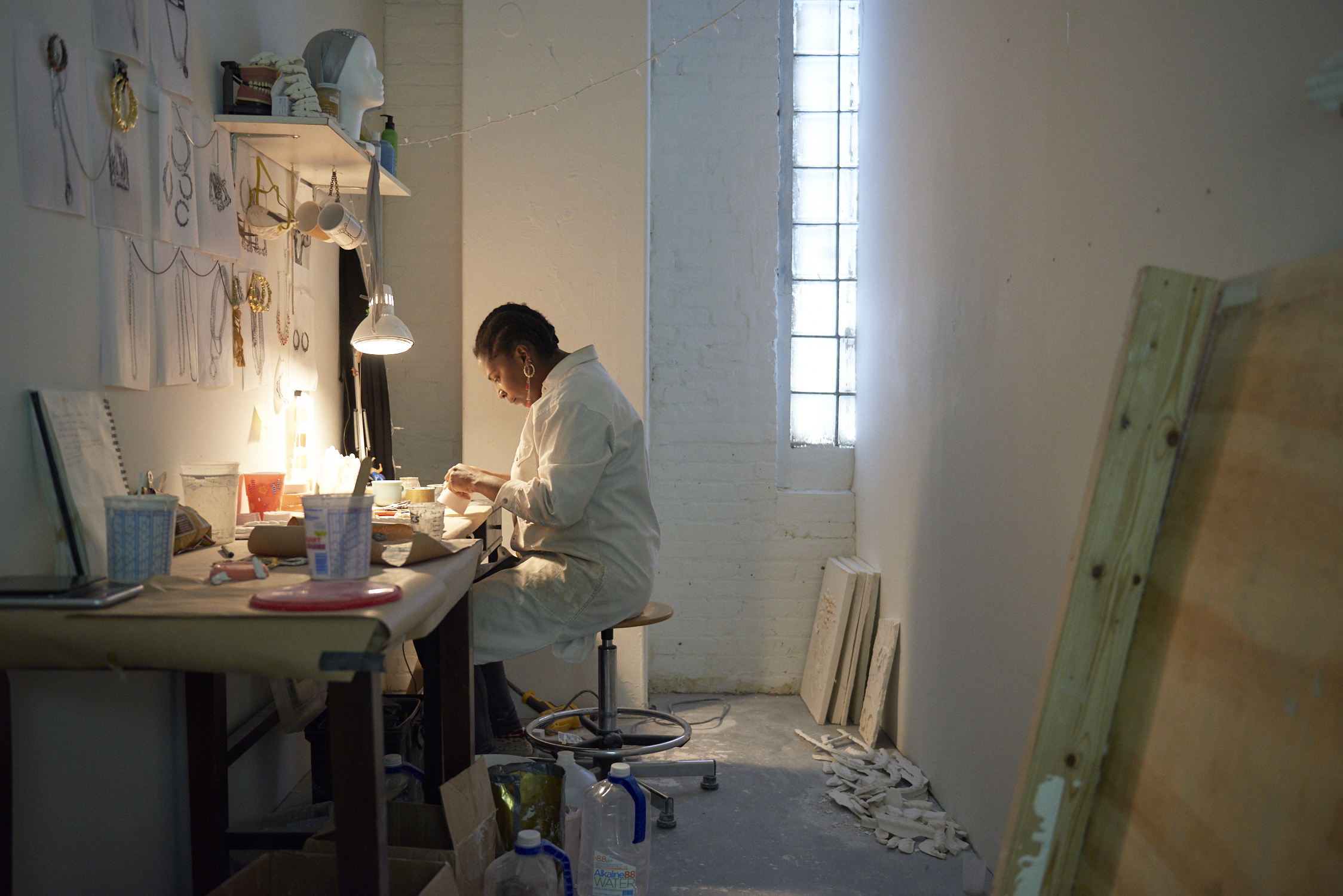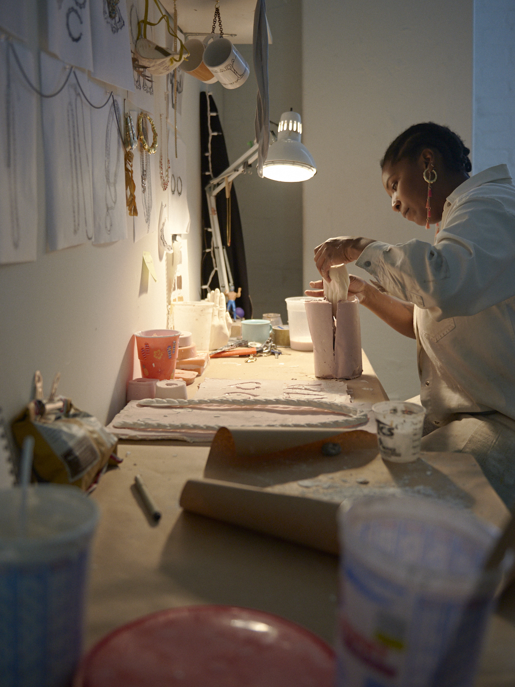 I love the plaster hand in “Composition with Bamboo Earrings, Impressed with Gold, Overlapping with Hand.” It feels like your own hand. It is actually a casting that I made from a mold of my own hand. Before I began making this relief work, I was making pretty traditional figurative sculpture, and sometimes parts find their way into this work. For this work specifically, the hand is the embodiment of desire, aspiration, hope, work, and fear. It also adds a piece of the missing human that the jewelry implies. It’s definitely a celebration of black American aesthetics that I grew up with. But I am also interested in exploring how these objects inform or indicate everything from gender expression to class and ownership.