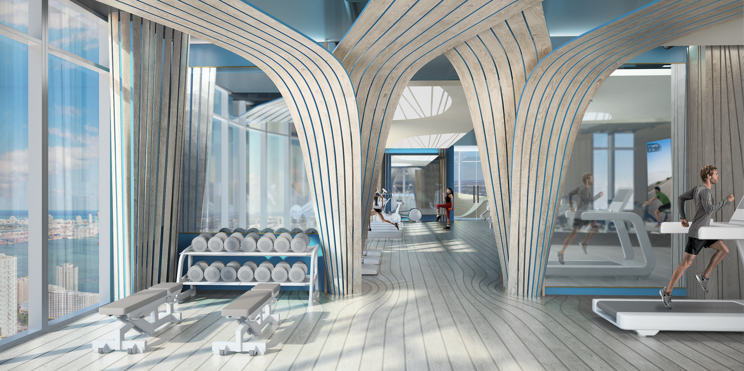Acclaimed Miami architect Luis Revuelta creates a one-of-a-kind architectural environment that combines the tower’s distinct flatiron shape with flowing, curvilinear forms.