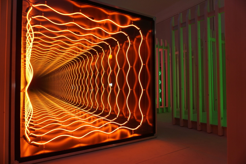 Kasmin and The Peninsula Chicago Hotel presents REVERB The Peninsula Chicago hotel teamed up with New York gallery Kasmin to host REVERB, an exhibition of the work of James Nares, Iván Navarro and Naama Tsabar. Displayed in the hotel’s public spaces is an exploration of movement, sound and electricity. The neon works, Impenetrable Room by Navarro in particular, draw the viewer deeper in; through the use of mirrors and glass, he creates a rabbit-hole rippling effect that entrances the viewer.
