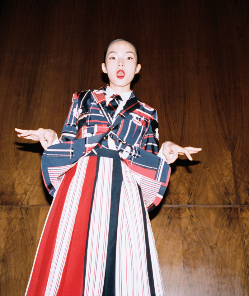 During the weeks surrounding our meeting, I enjoyed spotting Thom Browne garments around New York. A woman with runway model proportions walked ahead of me up Union Square’s subway stairs in a grey asymmetrical tennis skirt. At the opening for artist Sojourner Truth Parsons’s new mural in a former H&M in Soho, the artist admired a V.I.P. guest’s giant watermelon slice purse. And on the Upper East Side, an undeniable athlete ran up an avenue and down a street in a ringer tee and short track shorts. All these garments were confirmed as Thom Browne’s by a small tricolor ribbon: red, white and blue stripes, like a vintage Olympic medal, decorate every item, sometimes in big bands or, at the very least, via a small exterior tag.