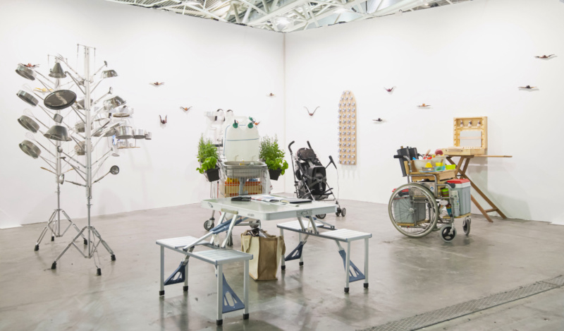 Opavivará! at A Gentil Carioca, Rio de Janeiro Exhibiting the Brazilian art collective Opavivará! in the Present Future section, A Gentil Carioca presented a relational booth for touching, massaging, printing, drinking, smoking and experimenting, where the audience was invited to socially interact. Co-joined smoking pipes lined the walls of the stand, while a baby stroller was turned a karaoke machine, a wheelchair sported a homemade bar for making mixed drinks and a shopping cart was transformed into a sink for washing dishes, as well as fruits and vegetables.