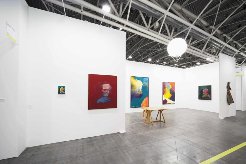 Gianni Politi at Galleria Lorcan O’Neill, Rome An Italian artist who was born in Rome in 1986 and lives and works there now, Gianni Politi considers himself to be an abstract painter, even though he also paints figurative canvases and makes referential sculptures that draw from his own life. In its Main Section booth, Lorcan O’Neill exhibited large-scale abstractions made by pouring and spraying paint on canvas, which the artist then ripped and cut into smaller pieces and collaged onto a new stretched canvas that got reworked with solid areas of paint.