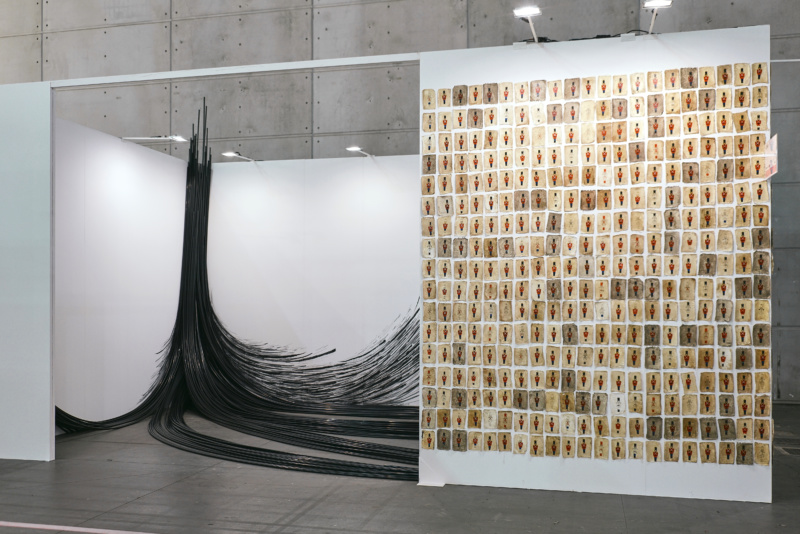 Muhannad Shono and Mohamed Monaiseer at Athr Gallery, Jeddah Pairing two Arab artists who work in contrasting ways, Athr Gallery presented Muhannad Shono’s massive abstract sculptural installation and small charcoal drawings inside its Main Section booth and Mohamed Monaiseer’s small-scale figurative paintings on its two outer walls highly effectively.