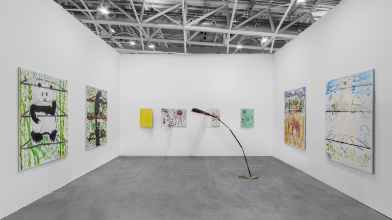 Rendered in a scumbling, sketchy painting style, the large-scale canvases and hinged smaller paintings are joined in the booth by an arching assemblage constructed from old pool sticks that are topped by a broom. Exhibited in the New Entries section, the mix shows why Artissima continues to attract adventurous artists and exhibitors looking to shake up the scene and collectors and curators who are seeking new ways of seeing an ever-changing world.