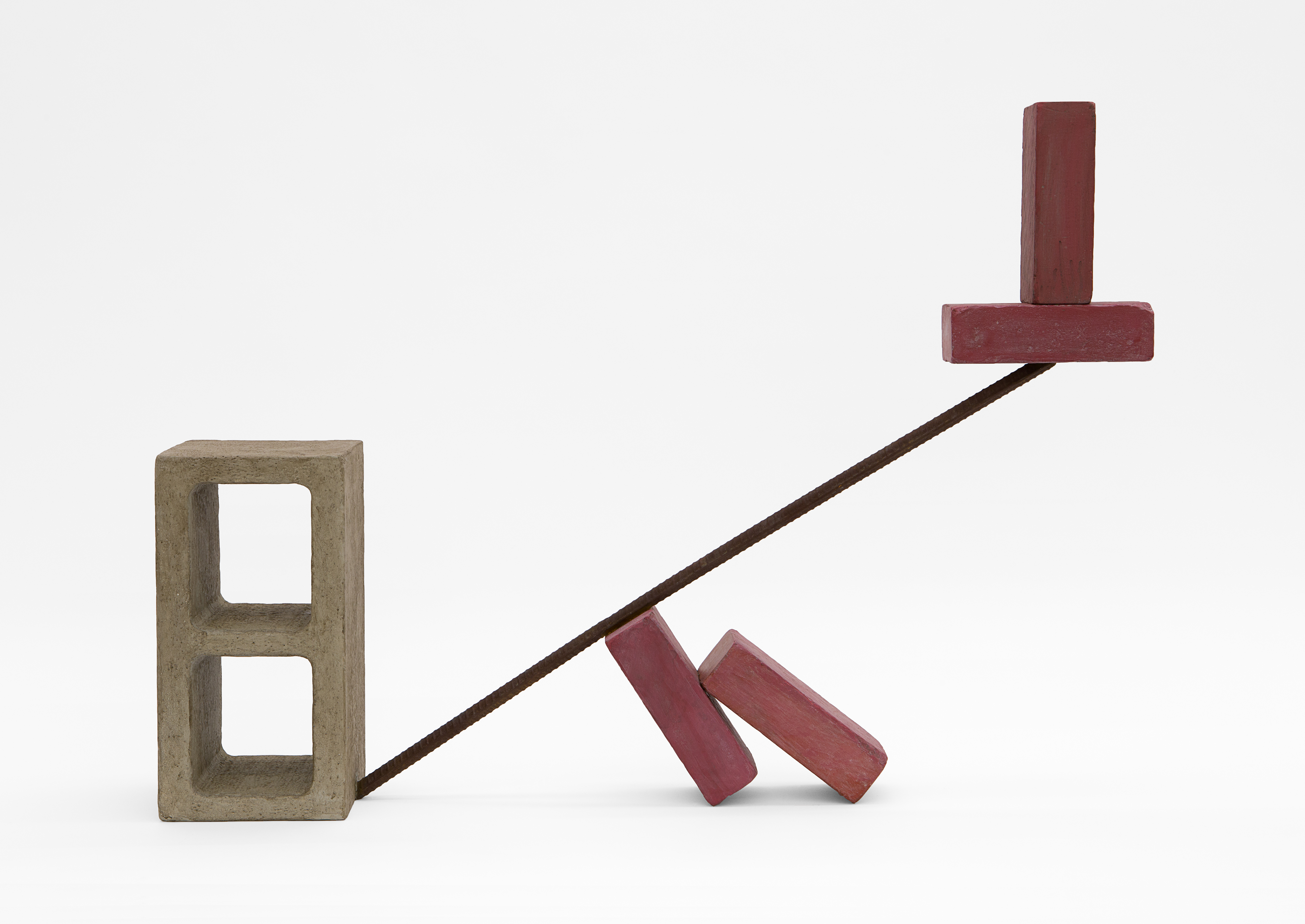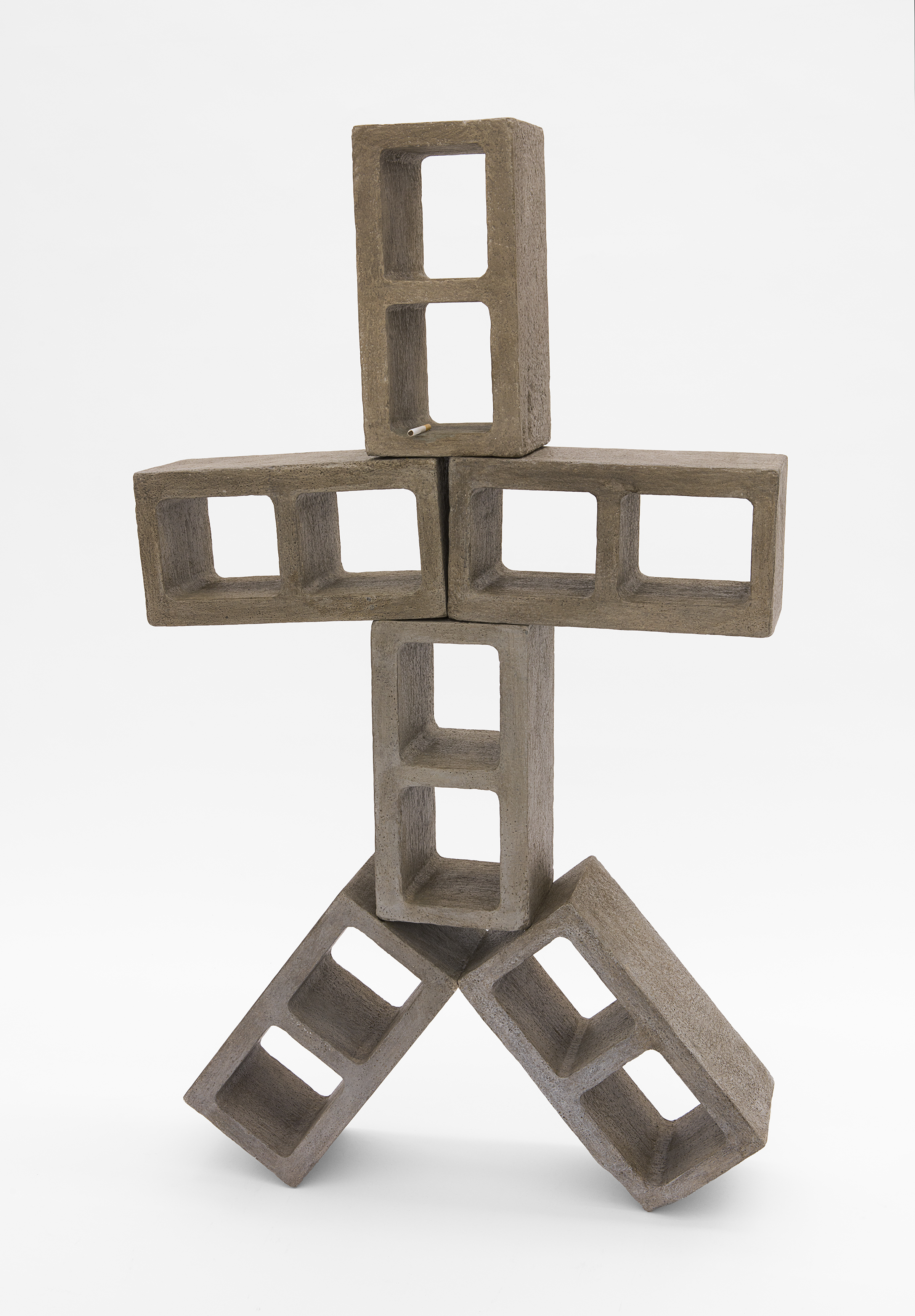 Other titles hint at what the combined objects allude to, like 11 brick reclining figure with 1 bar and a Matisse book, wherein wooden bricks and rebar rest atop a Matisse catalogue (also made from wood), the whole composition folding into a Henry Moore-esque reclined figure when seen from the right angle. The masterful 7 block and 36 brick horse achieves a similar effort, as bricks and blocks cascade in the most unlikely of forms which, from a certain angle, also references an equestrian sculpture. Finally there are the quasi-figurative works, such as 6 block standing figure with a cigarette, wherein six cinderblocks stand up, the “legs” at precarious angles, to form a figure. A cigarette hangs from its mouth, as if the blocks have briefly clocked out from their role as objects.