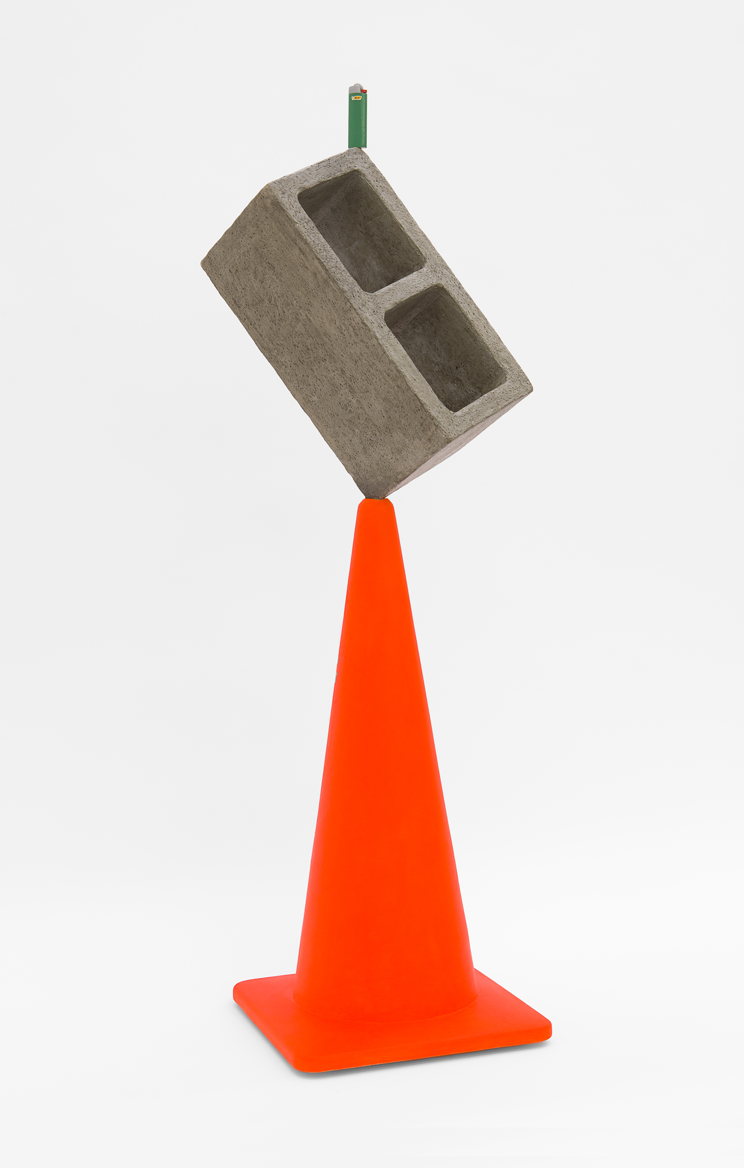“Traffic cone with a clock and a lighter,” 2019, polychromed wood. Image courtesy Blum & Poe.