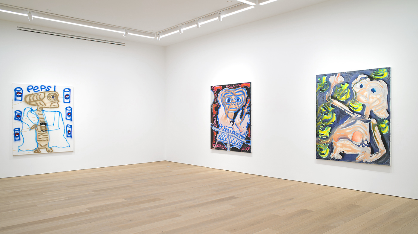 “Katherine and E.T. have lots in common,” wrote Katherine Bernhardt’s sister Elizabeth, in an essay on the occasion of the artist’s solo show, “Done with Xanax,” which opened last week at Canada Gallery’s new Tribeca location. “Growing up in the suburbs, she immediately identified with E.T., who himself landed in a suburban setting and could not figure out how to get away from it while suffering great existential pain.” In the show, Bernhardt debuted 11 paintings, each of which stars the empathic, titular alien of Spielberg’s 1982 masterpiece. In Bernhardt’s distinctive style, objects like Pac-Mans, telephones and Xanax bars float freely in the singular universe of her canvases. In this world, the extra-terrestrial once again becomes our protagonist. Painted by Bernhardt on the patio of her childhood house, the paintings’ nostalgia grows more poignant. May we all be so lucky as to phone home.