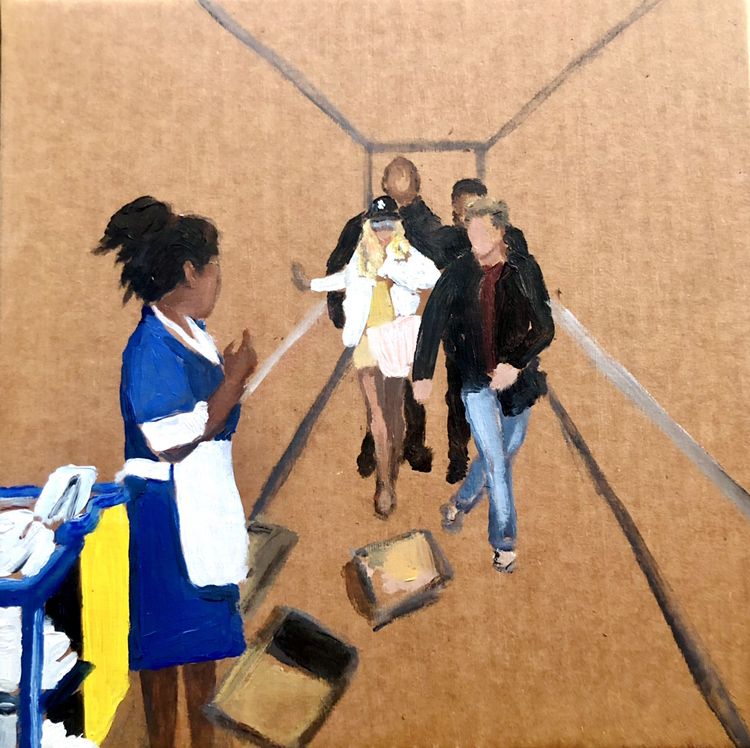 Can you tell me more about the new Britney Spears painting you posted on Instagram? Britney is gallivanting down a hall with her entourage, but the composition focuses on the hotel housekeeper. I’ve been kind of obsessed with the image. First, it’s key to know that music is super important in my process. During the lockdown, I started doing those social media challenges with friends that are floating around, and one of them was the 30 day song challenge. It asks you every day to share a song that, let’s say, reminds you of someone you’d rather forget or a song with a number in the title. And every day is different, so it forces me to recollect. One specific prompt asked for your favorite cover of a song. My answer was the song by Sondre Lerche—“Everytime”—which is a cover of Britney’s version. I love the original song too. Britney was one of my queens and there’s this moment in the “Everytime” video that struck me. The video takes place in Vegas; Britney is walking with Stephen Dorff through a hallway—they’re a couple and they’re fighting. Then, out of nowhere, Stephen Dorff’s character kicks a bunch of cardboard boxes towards a housekeeper, who’s like “what the hell?” It was so strange to look at the video. I said to myself, “I’m going to go to make a painting based on that scene and post it on Instagram, along with the song.” But I made my painting about the housekeeper. Britney and Stephen are devoid of their own features. I didn’t want them to be the focus, even though they are part of it. I think when you share work on social media, there is a kind of pressure, but it’s different than when you are presenting art for a collector at an art fair. The paintings I’m posting are for myself—and for an audience that is dealing with all these uncertainties too. Art is a respite. So I don’t question it. I just say, “Hey, let me share this work online right now.”