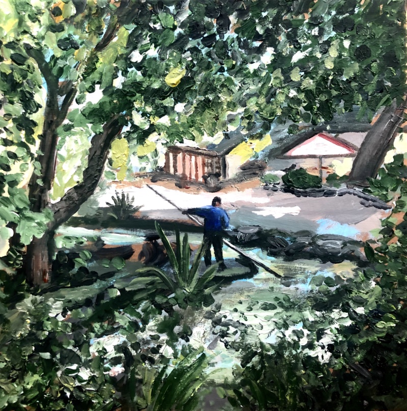 Ramiro Gomez, Jr. paints the people absent from home decor shoots and the modernist houses so valued by luxury advertisers, restoring the army of laborers—pool hands, uniformed maids, gardeners—who make such lush scenes of the “American Dream” possible in the first place. Famous for his subversion of Hockney’s 1967 painting A Bigger Splash, Gomez’s 2013 version—No Splash—reimagines a faceless man cleaning the Pop Art pool and a woman sweeping the patio in the backdrop. Initially, Gomez’s inspiration for his subject matter was sparked by his years as a Los Angeles nanny. During the children’s naps, he would look at architecture and design features in Architectural Digest, struck by the similarity to his own surroundings. From this, grew his celebrated magazine series, as much a diary of his lived experience as a record of the domestic workers erased from the visual and social landscape they are indispensable to creating. As the weeks of social distancing grind on, Gomez’s Instagram account has increasingly become an outlet for his practice, not to mention a daily destination among art insiders. I caught up with Gomez by phone in his West Hollywood home to learn more about how he’s been coping with work and life in the last few months.