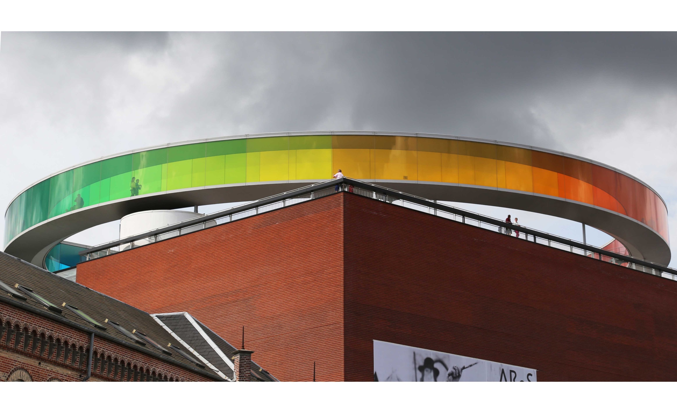 But seeing the artwork from a distance is only half the experience. The skywalk, a permanent installation set on slender columns, offers unobstructed views of the surrounding metropolis and makes innovative use of the Nordic light, shading in rich colors at different points in the circle. And, just as it is a joy to walk Eliasson’s loop and look out toward distant buildings, it is a pleasure to turn inward and look across the circle to others enjoying the view. Your Rainbow Panorama is also a welcome third point on the city’s remarkable triangle of design, which includes Arne Jacobsen and Erik Møller’s Aarhus City Hall and C. F. Møller, Kay Fisker and Povl Stegmann’s Aarhus University campus.