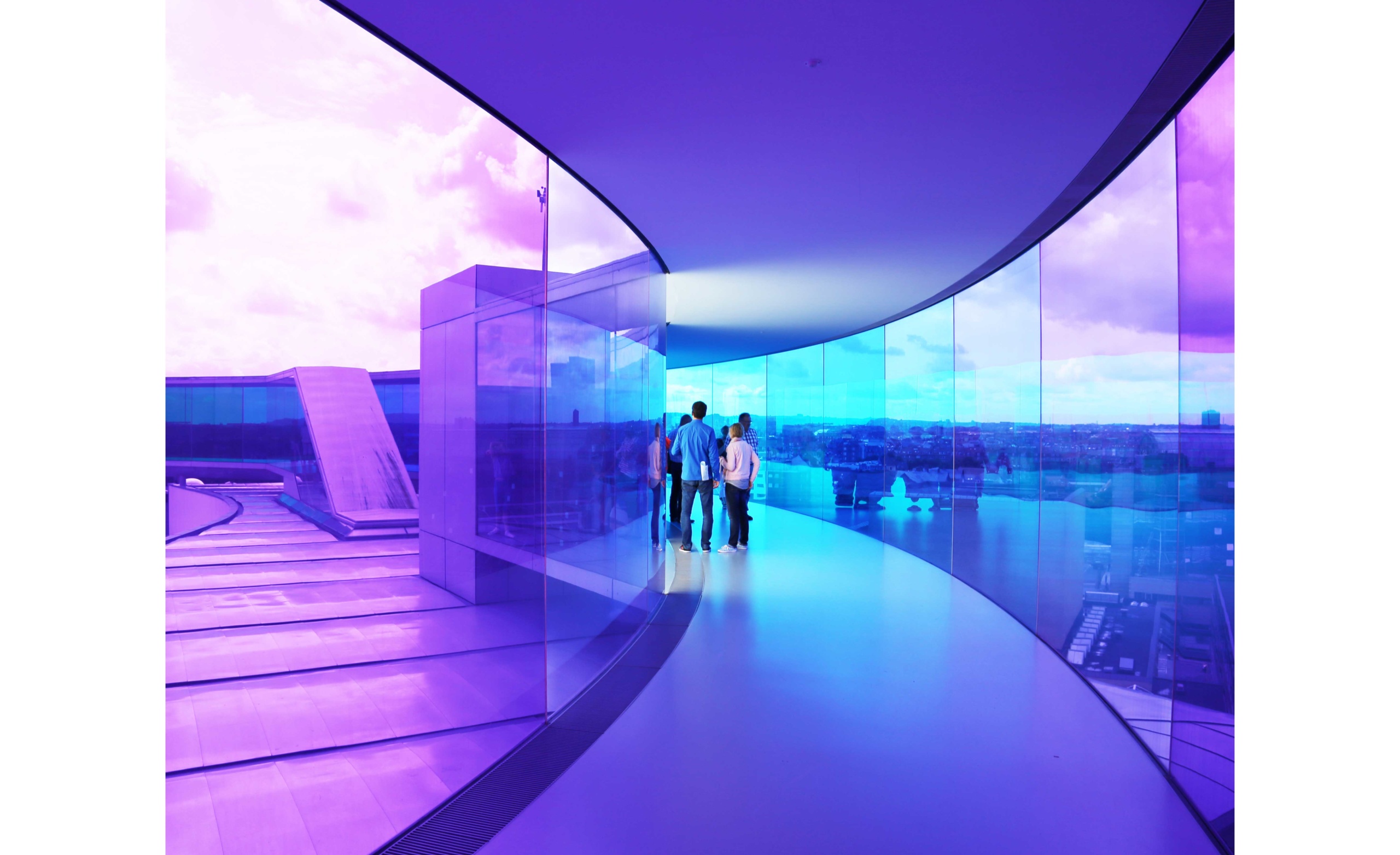 Danish-Icelandic artist Olafur Eliasson is known for large-scale installations that incorporate elements of light, water and air, all of which elaborate on important issues of our human relationship with nature and earth. Being from a region of the world that has an intimate relationship with light and darkness—home to both the shortest and longest days of the year—Eliasson’s work is demonstrative of how life imitates art and art imitates life. During this week of the Summer Solstice, when the sun is in its highest position on the spectrum, we look to a permanent installation he designed in his home country, Your Rainbow Panorama, which celebrates the color spectrum, bringing light to the sometimes fogged-over coastal city of Aarhus, Denmark.
