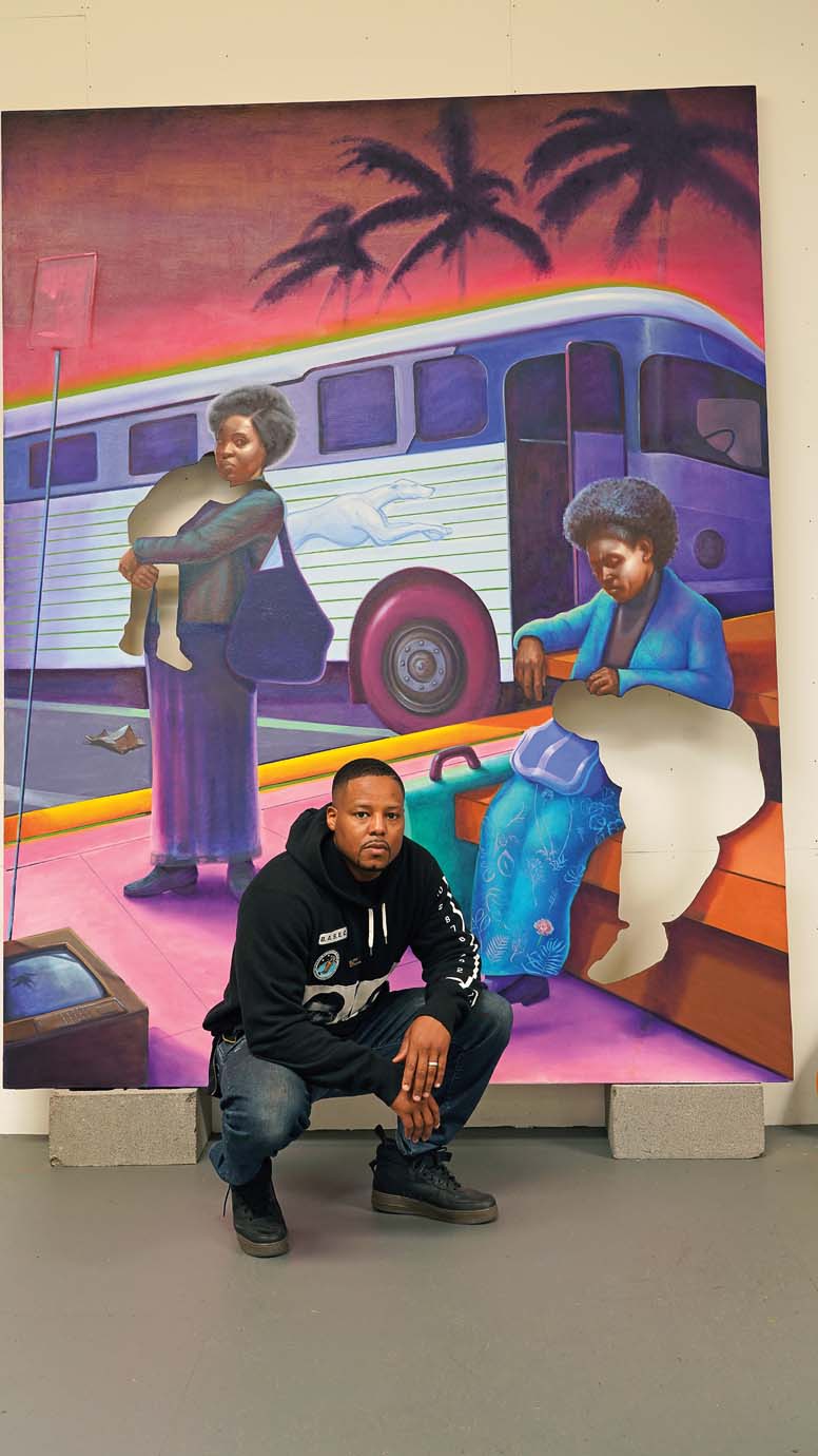 Kaphar poses with The Distance Between What We Have and What We Want (From a Tropical Space) (2019) in his New Haven studio.