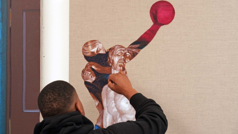 Based in New Haven, Connecticut, Kaphar has long ranked among influential and in-demand contemporary artists. A recipient of a 2018 MacArthur Fellowship, he surfaces racism by subverting the Eurocentric tradition. Colonial and Renaissance portraiture underpin Kaphar’s practice, with a restorative twist, reflecting the voices of people suppressed over and through those centuries of art and history. Famous for excising figures from a painting to focus on other characters in a composition—or to heighten absence—Kaphar’s work hovers between the second and third dimensions. Aesthetics, he’s said of his approach, often function like a Trojan Horse, beckoning viewers to open their hearts to difficult conversations about America’s racial past and present.
