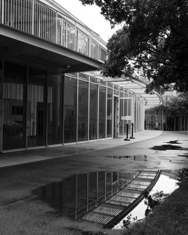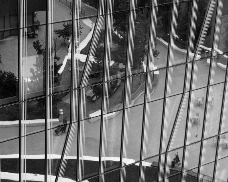 The glass skin of Tata Innovation Center at Cornell Tech reflects back its courtyard.