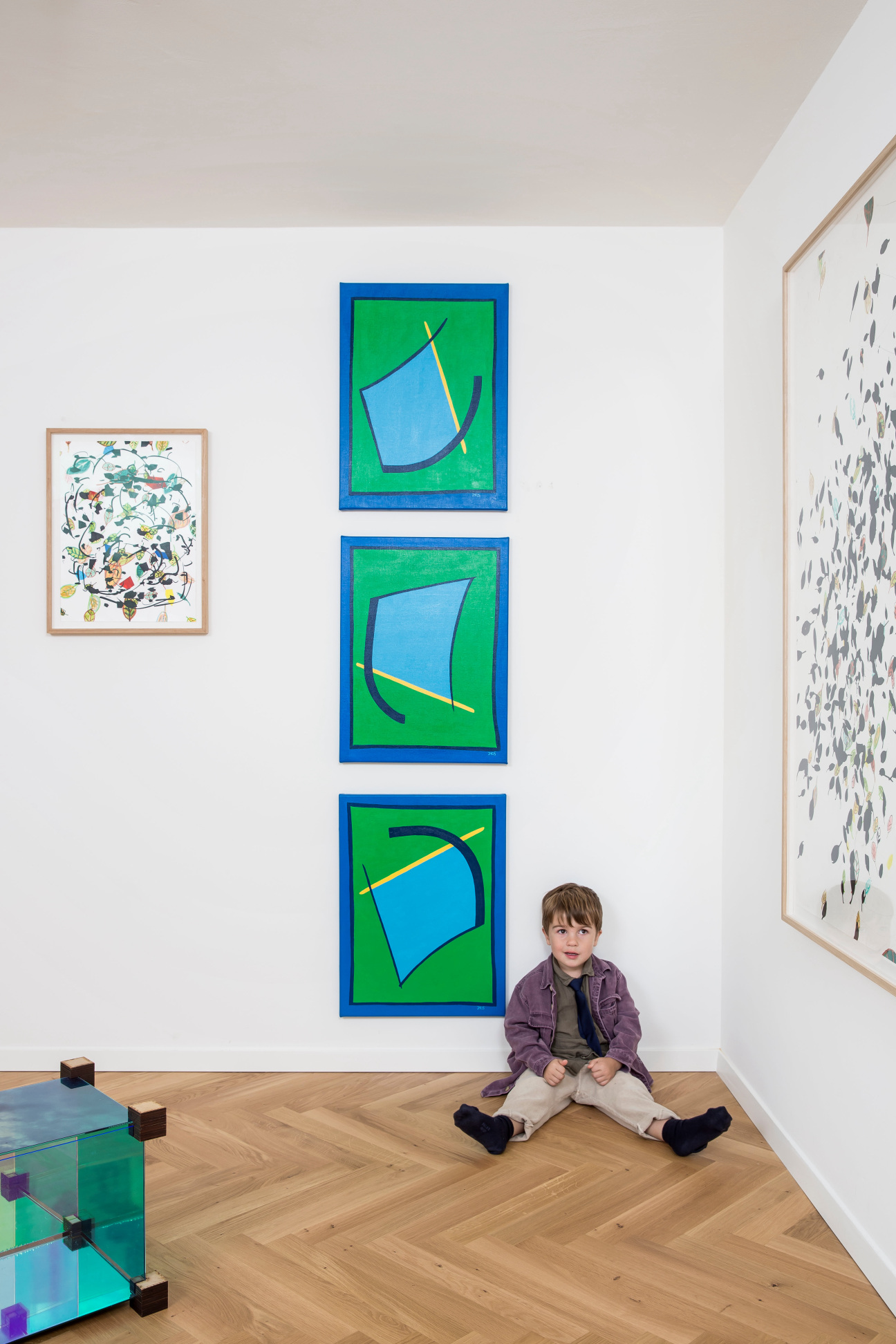 Eva's son Henry sits in the gallery with Johanna Kristbjorg's Part of Somewhere between green and blue, 2020; Pall Haukur, Untitled traps, 2021 and Pall Haukur, Untitled, 2021, drawings.