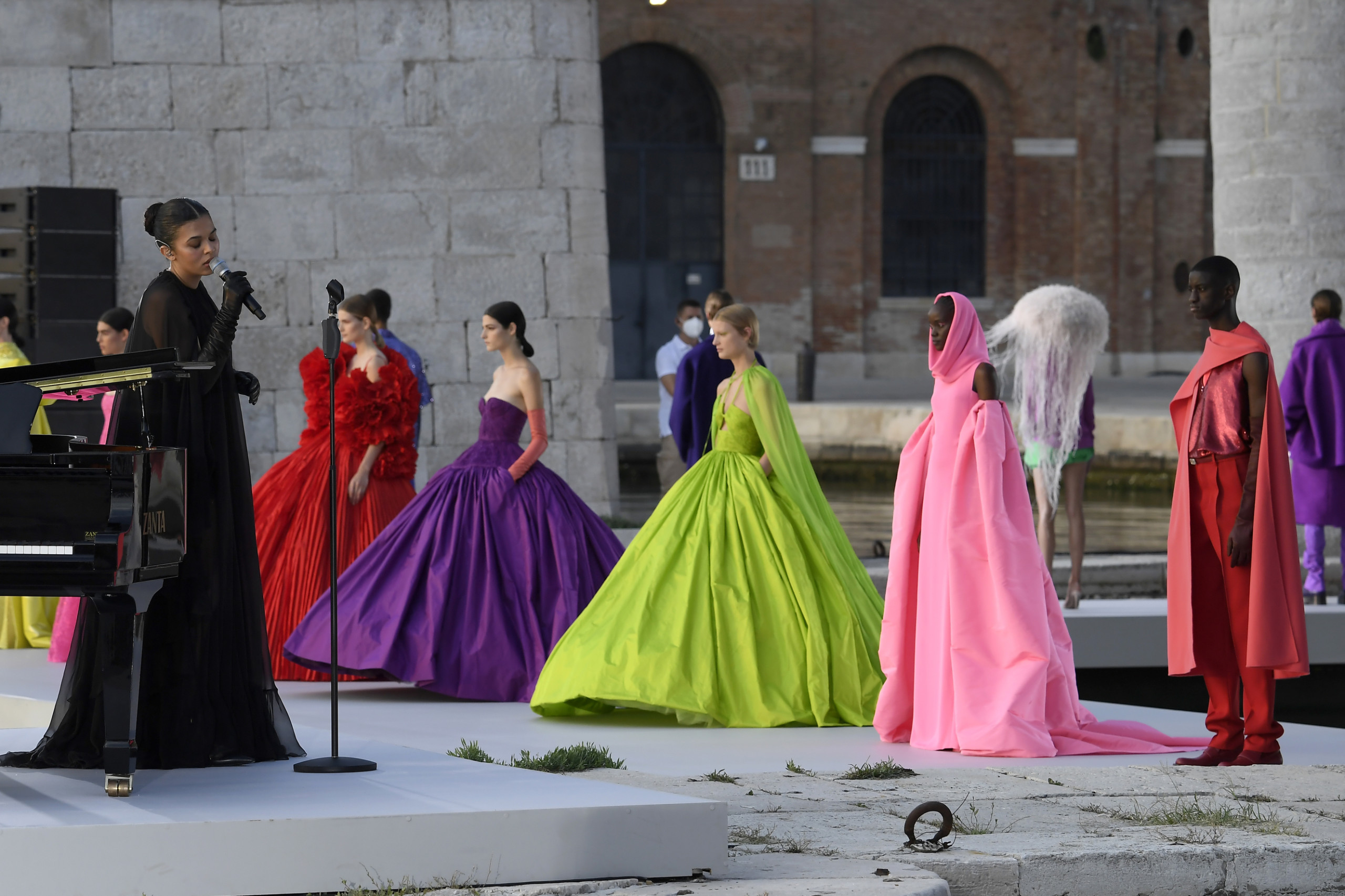 Singer Cosima can be seen setting the mood for the sunset runway show in the historic Arsenale. Photography courtesy of Valentino.