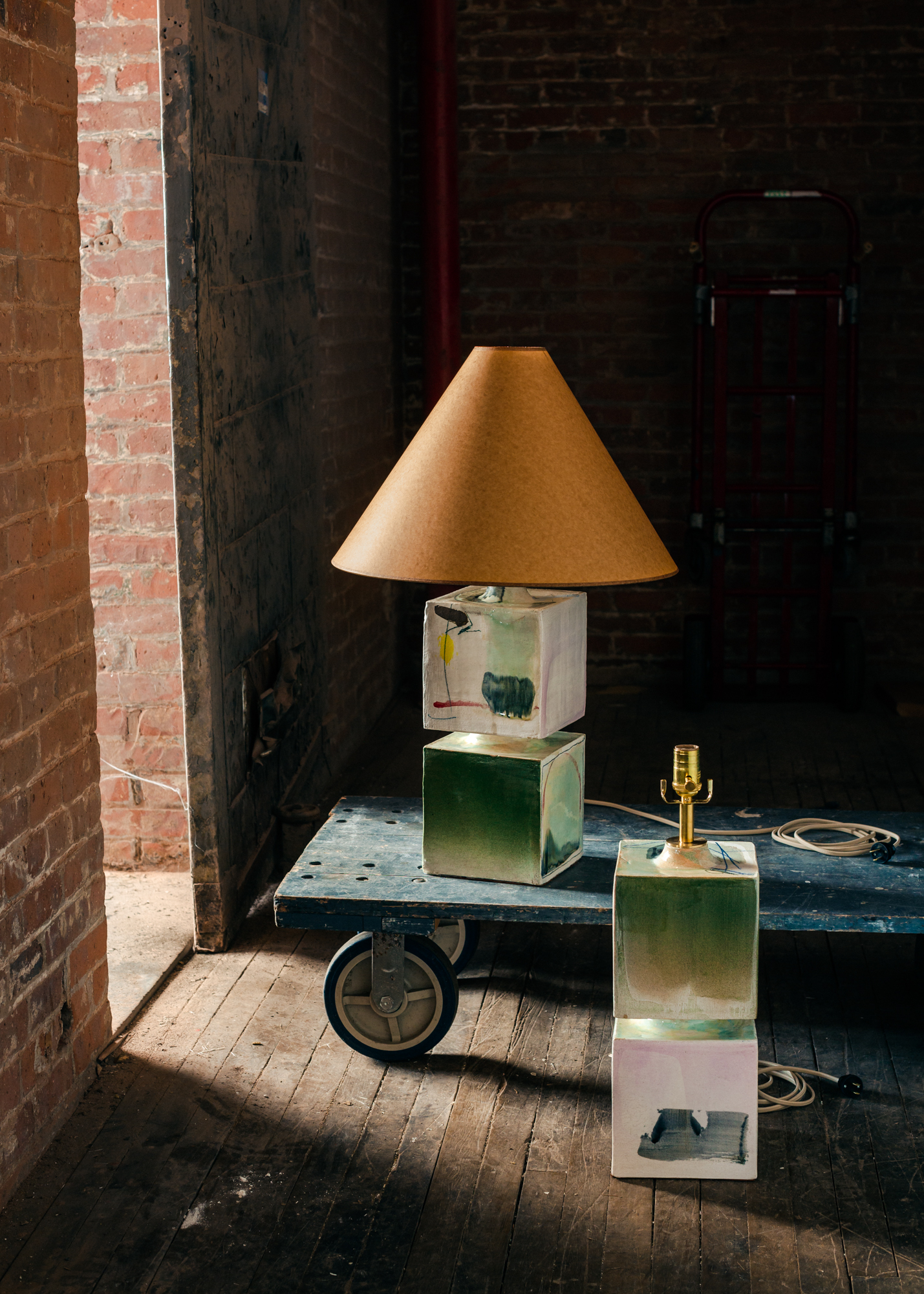 In this ten-lamp collection, the pair’s work strikes a balance between geometry and softness. “The form of the lamps means that no matter where you look at them you have a completely different experience,” says Kaplan who notes that he chose the stacked cubes shape for the bases because it “allows each side to be a canvas” for Grizzo’s watercolor-like washes of abstractions in color and glazes, which were achieved after many firings. “In a lot of my work I try to combine architectural elements and organic connections,” he adds. Brutalist architecture is a big inspiration for the artist who says that the lamps’ square volumes were created using a slab process then “linked by a soft, almost bodily connector.” The shades were also carefully chosen so as not to disrupt the sculpture beneath.