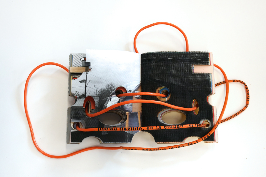 Lively conversationalism—exchange, relation, drama, surprise—pervades his work. A devoted reader of concrete poetry, Domenech assigns poetic titles to works that attempt to provoke engagement. Take The plastic river has no corners (2021), a sculpture made with plywood, plexiglass, glue, vinyl, construction mesh and other materials. It looks like a book with a well cracked spine but has a safety-orange extension cord weaving through circular and oval holes. The title itself extends, obscures and disrupts rather than clarifies the object itself. “When I title works, I always try to put a title that can point away from the work. It drags that work with you, but it also points somewhere else,” he says. “You know, it adds another image on top of the image.”