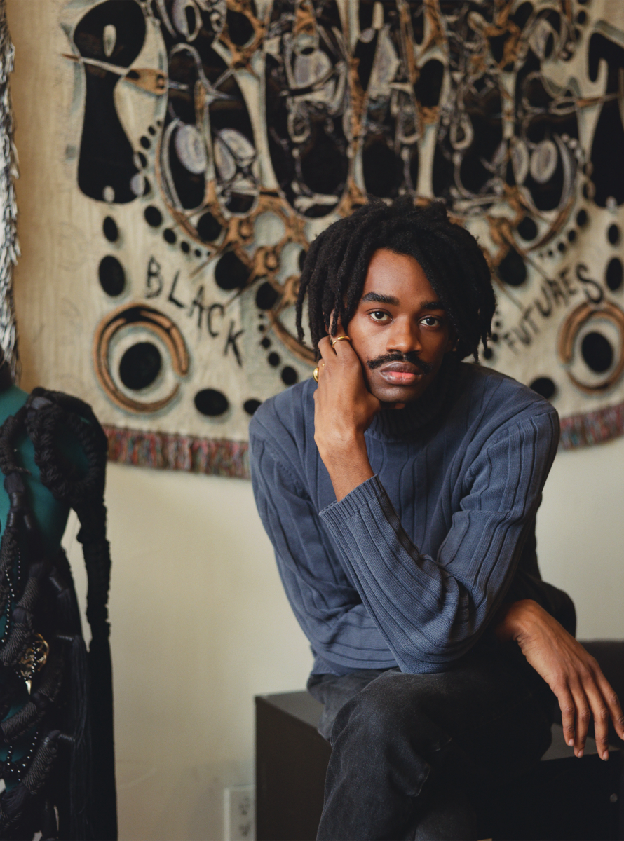 “As a kid, I had a lot of free time and I occupied myself with making art, or imagining and being in these kinds of dream spaces that I now recognize as really central to my practice,” Jameel tells us. “I started with anime and manga and comic-book drawing, which involves a lot of character design and development and a lot of thinking of how what this character holds and wears kind of signifies that they’re in an alien realm or a futuristic realm.”