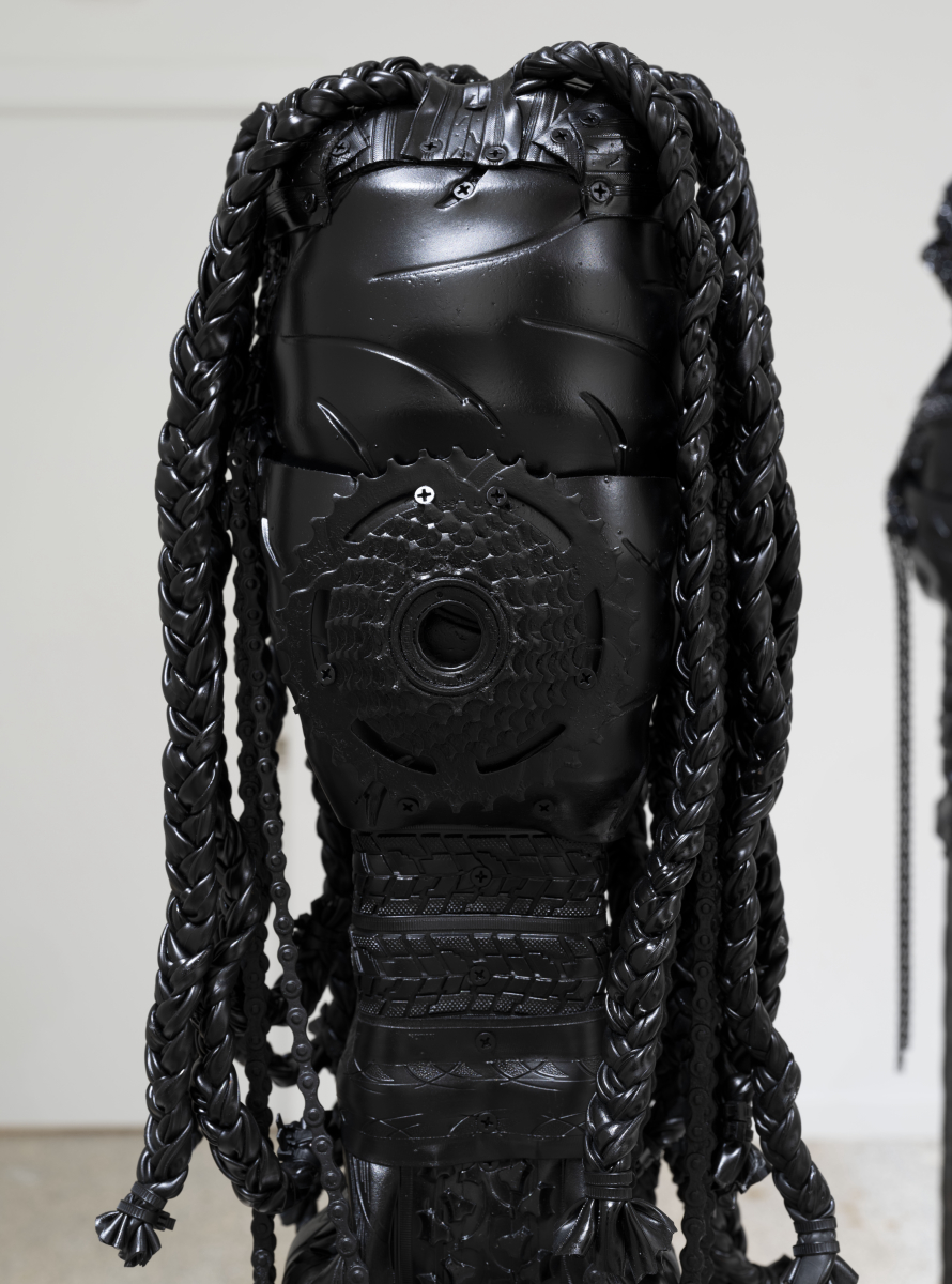 The show’s eight mixed-media sculptures are made of automobile and bicycle tires in addition to a range of hardware that Dacres assembles at her studio with jigsaw, drills and heavy-duty scissors. Though monochromatic, their varying sheens reveal the chromatic range of the color black. The eye level height totems pay homage to matriarchal figures in the artist’s family, and personalities are represented in facial expressions and sartorial details.