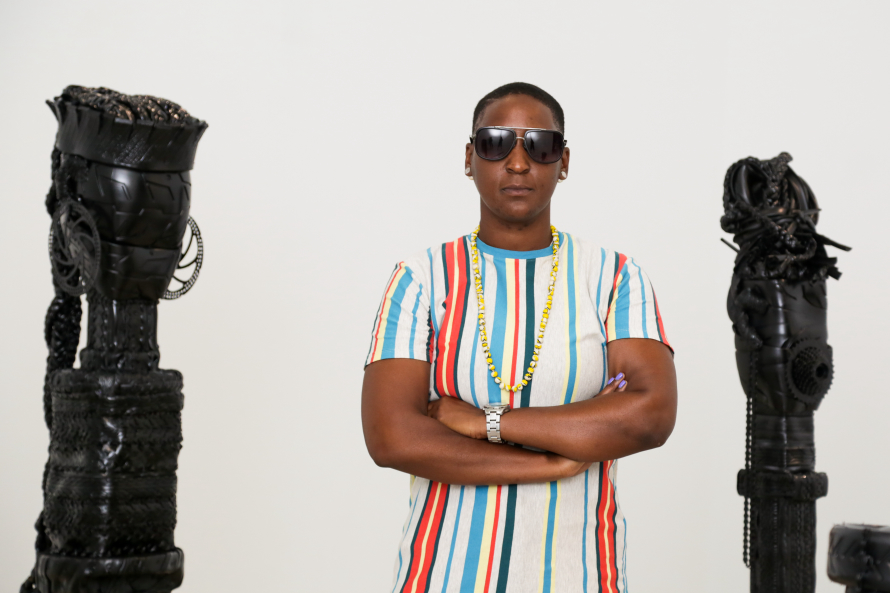 After a decade working in education, she returned to the material a few years ago. Dacres initially transformed tires and hardware bits into busts. However, a few incidents where people overlooked the works’ physicality and touched or leaned onto them prompted her to leave pedestals for the totemic scale. “As a history buff, I understand that chess is not a game, it’s about war,” she says. “Entering any space as a Black queer woman artist is not so different either.”