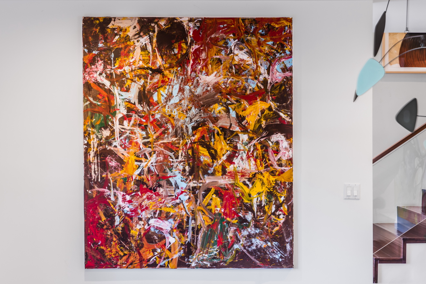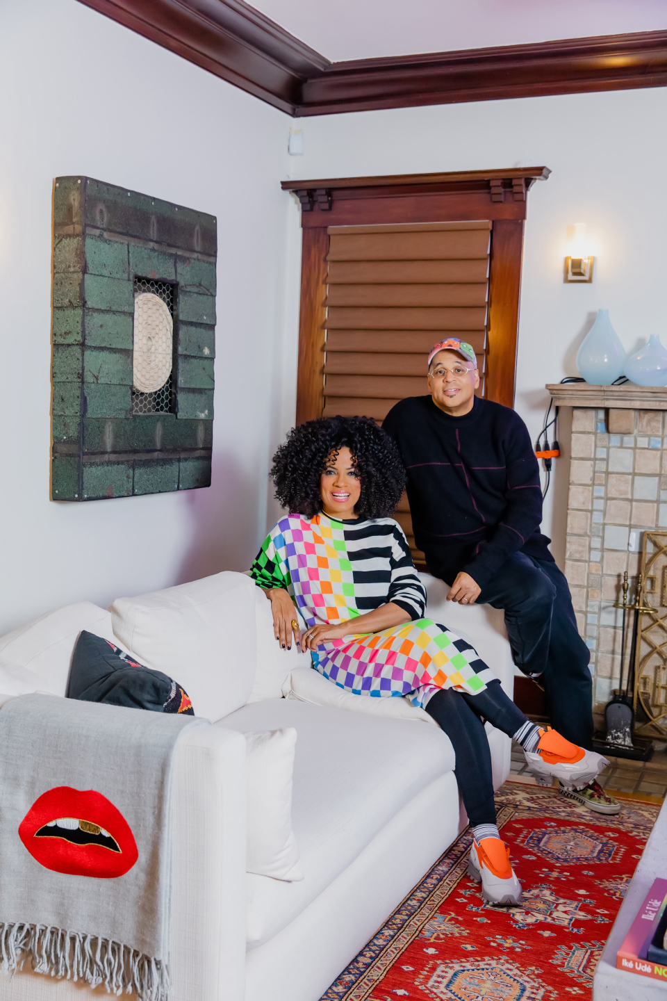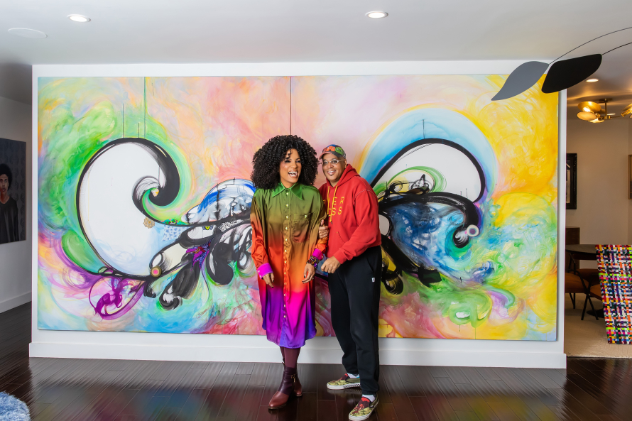 Janine Sherman Barrois and Lyndon Barrois at home in Los Angeles in front of Shinique Smith's 2021 painting, And Her Wings Stretched the Horizon.