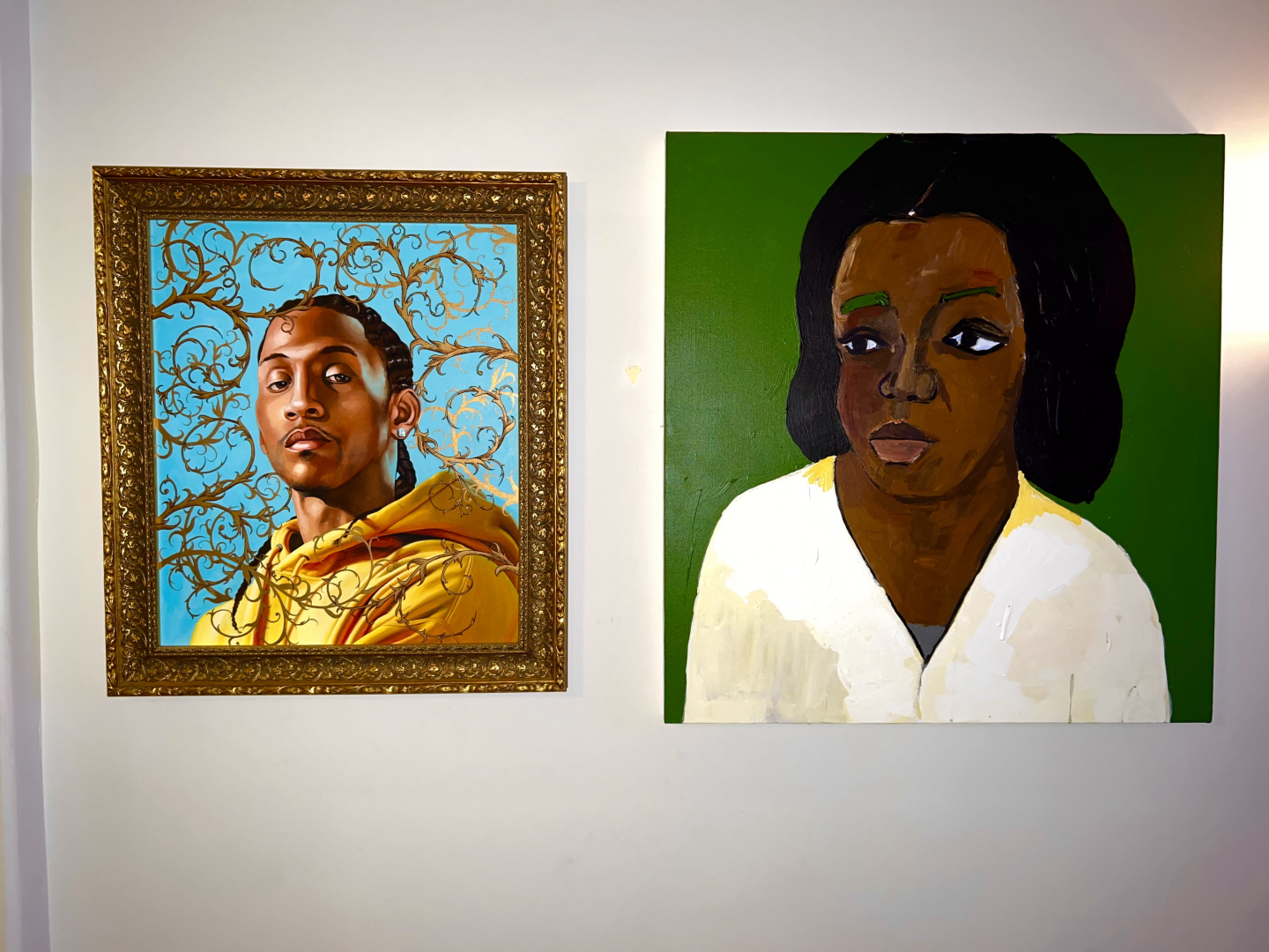 Left: Kehinde Wiley, Portrait of a Young Man III, 2006. Right: Henry Taylor, More Justice Marley, 2017.