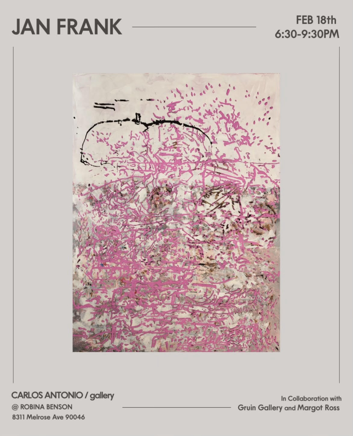 On February 18, artist Jan Frank opened a solo show of work old and new at Carlos Antonio Gallery at Robina Benson Design House in Los Angeles. In 2020, designer and entrepreneur Robina Benson opened the 10,000-square-foot showroom on Melrose Avenue as a creative hub to allow discerning shoppers to browse the latest collections from luxury design companies including Paola Lenti and Giorgetti, as well as art by tastemakers like the aforementioned, providing an all-in-one shopping experience for hospitality and residential clients alike. During Frieze Week, the Dutch American painter premiered the exhibit in collaboration with Gruin Gallery and Margot Ross. It features a stunning seven-piece series of large-scale abstract multimedia paintings in which ink, oil, and screenprints cover the linen canvases with abstract brush strokes, patterns, and splatters.