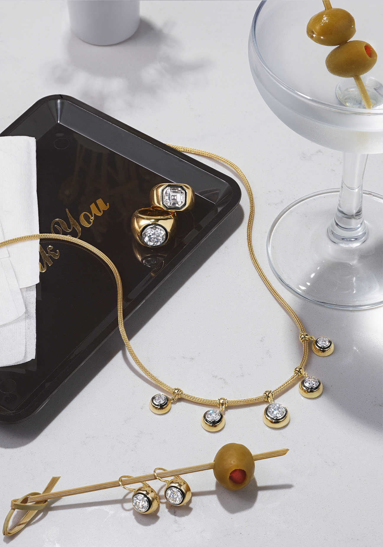 Nina Runsdorf "All That Is Martini" Scene: For sale, All That Is 3.07ct Round Pinky Ring, $165,000 and All That Is 5 Stone Necklace, 18K Yellow Gold and White Gold, 5 Stone Brilliant Cut Diamond Necklace, on 18K YG Mesh Chain, 17", featuring 2.59tcw Diamonds, $68,500