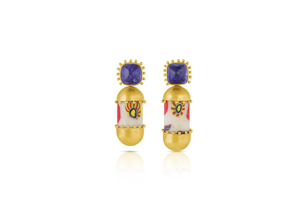 Loren Nicole Murano Cylinder Earring, 22k gold, Tanzanite, Antique Murano Glass, $14,800
