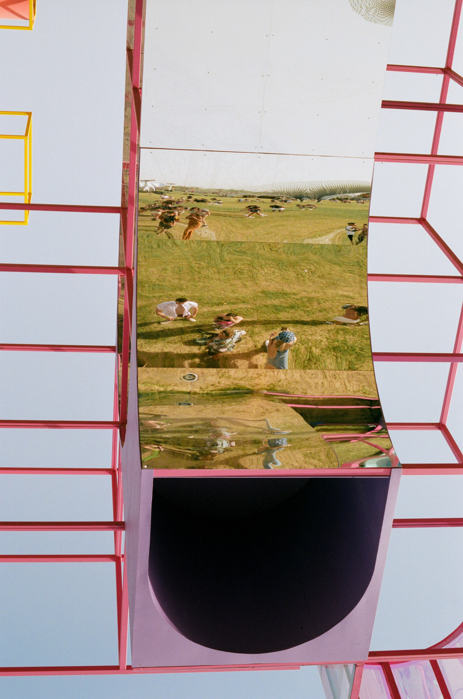 Amidst the sea of people at the festival during weekend one were three, four-story-tall and angled buoys floating in the grass. Kiki Van Eijk, an Eindhoven, The Netherlands-based designer, wanted to create a surreal and happy space for everybody. Each buoy includes cultural references that emphasize the beauty of diversity and inclusivity, and they create a fantastical space to meet and interact with the people around you. At night, LED lights enhance the sculptures’ silhouettes, while the daytime offers a softer and calmer experience. The buoys are designed as a Dutch-style windmill, an igloo and a larger, palm tree-crowned pavilion with a seating area inside.