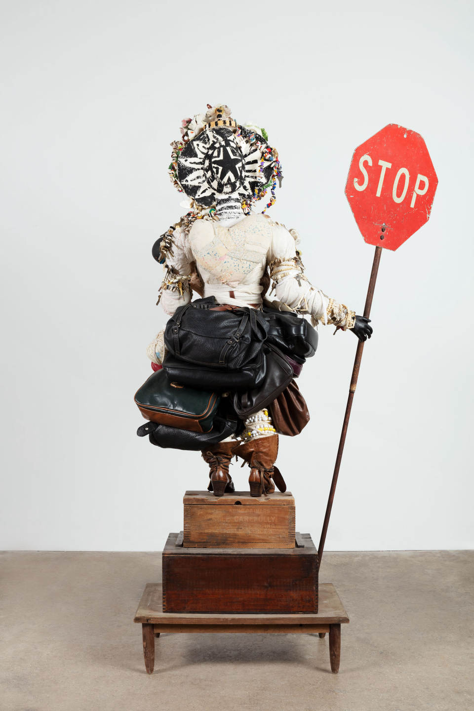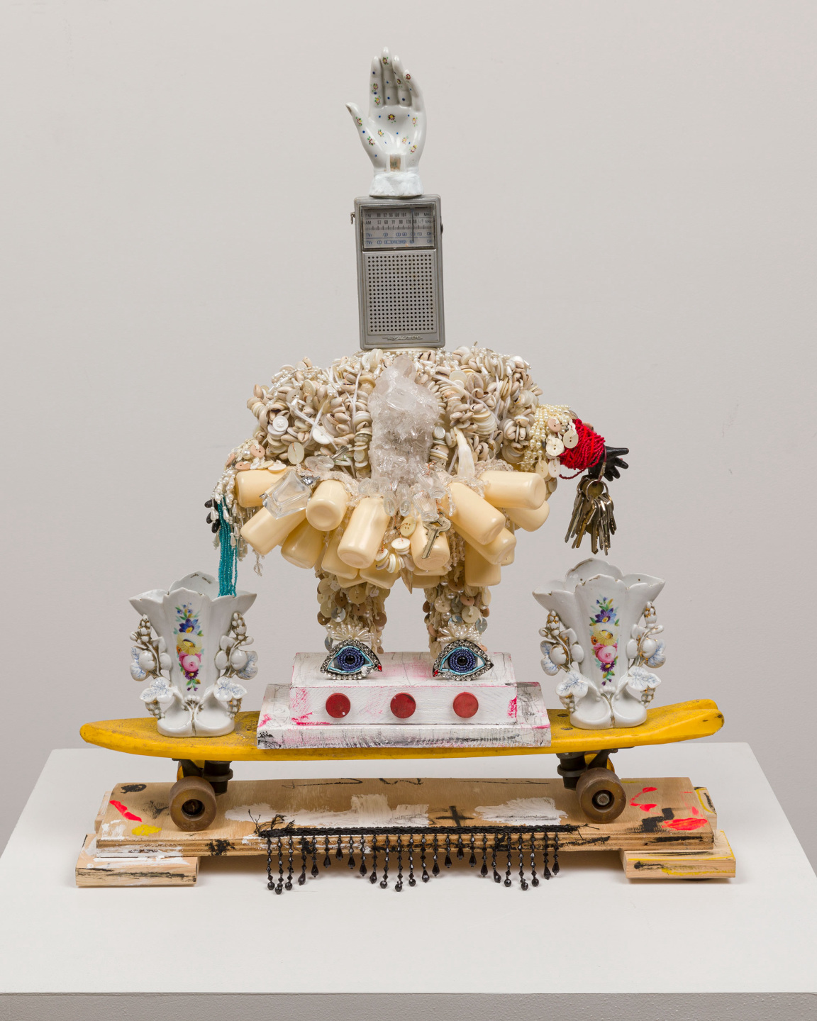 From here, the artist brought additional degrees of complexity to her “power figures” by adorning them with other objects she found on her strolls, including shards of glass, bottles, charms, fabric, shells and mirrors. While these figures assume shapes that resemble the human form, they are not meant to represent specific individuals. Rather, german is interested in crafting an energetic impulse that affects the viewer, even if their particular meanings or purposes cannot be discerned. In the past, german has remarked that these figures are meant to serve as protectors of Black people against violence, and as celebrations of freedom and unbridled creativity.