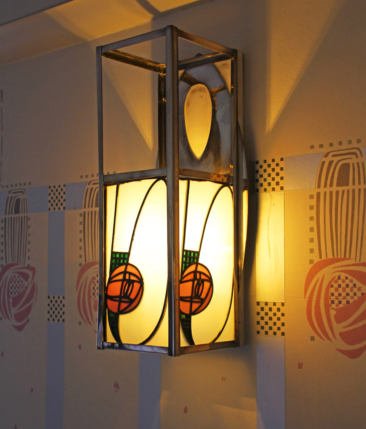 Mackintosh’s strong, graceful rectilinear lines are balanced with lyrical, naturalistic accents in illustrations and paintings throughout his work. The fireplace—often a place where the Art Nouveau style is expressed most flamboyantly—is framed by a glinting silver geometric mosaic with abstract features and, just above it, there is a beautiful gesso panel by the artist Margaret Macdonald, Mackintosh’s wife and close collaborator. The painting, famous in its own right, is of a sleeping woman wrapped in vines, resting on a bed of roses.