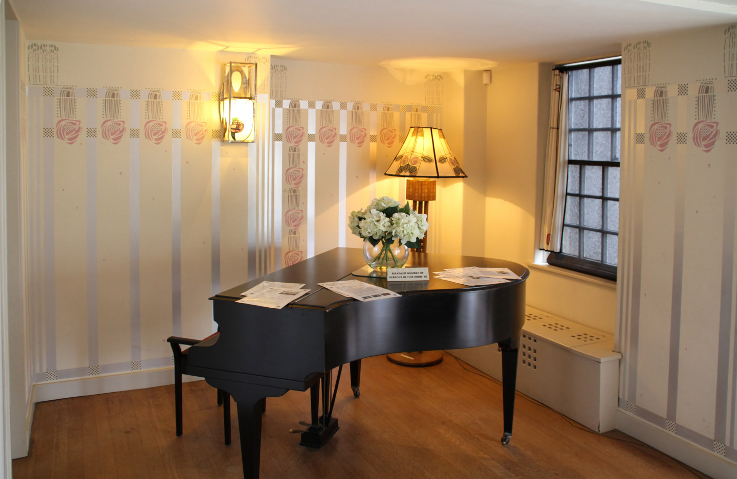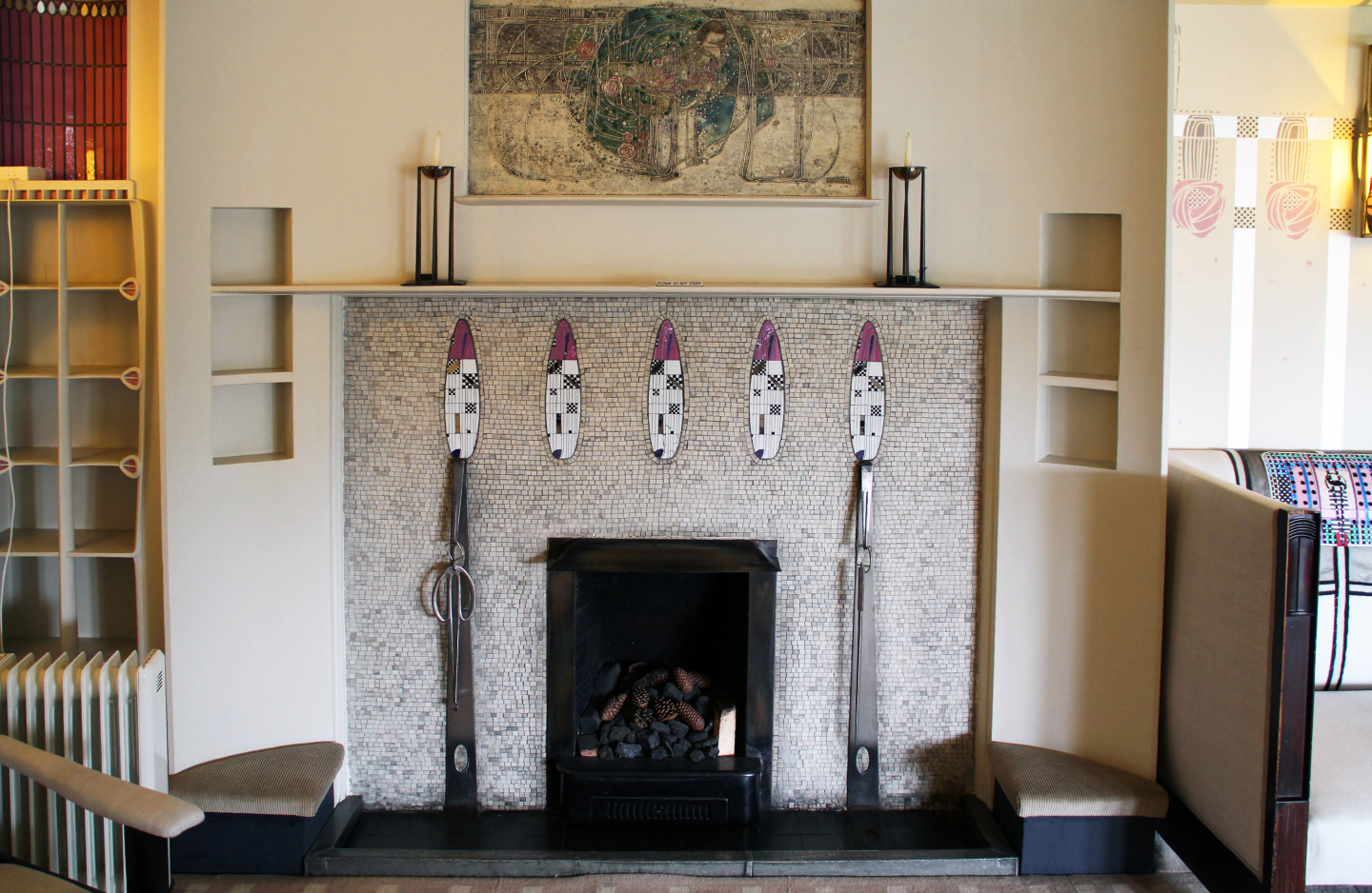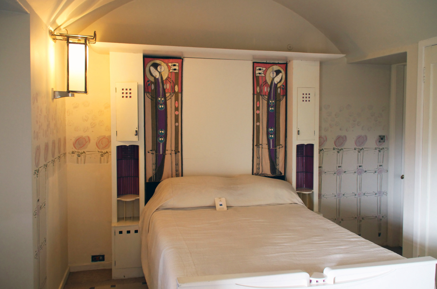 Upon entering the drawing room, a bay of light comes in through the large Shinto screen-inspired windows and purple stained-glass portals. Mackintosh provided the room with generous light to encourage creativity and freedom, according to the documentary A Modern Man (1996), which recorded the architect’s life and work. The palette promotes this mood: the light reflects brilliantly off the white interior walls, punctuated with playful silver, purple and pink accents.