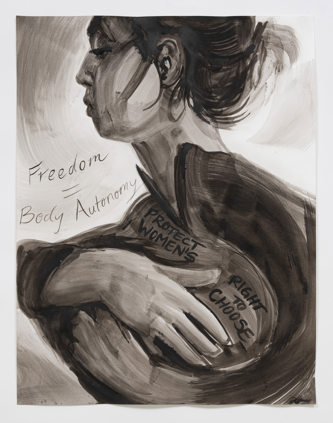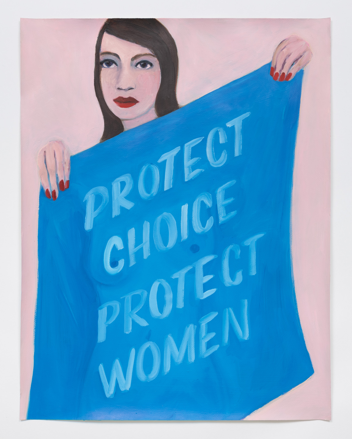 Titled “Impact: LA for Choice 2022,” participating artists include Avery Wheless, Becky Kolsrud, Emma Webster, Gwen Hollingsworth and Kate Pincus Whitney. Each utilizes her own figurative style to convey a message about bodily rights. In Kolsrud’s signature peach-and-blue color palette, Protect Choice Protect Women portrays a woman holding a banner featuring this declarative title. Webster paints a colorless profile of a woman hugging herself (Freedom = Body Autonomy) while Wheless’s abstract piece, Reaching as we fall, evokes the feeling of despair. All 44 lots in the auction can be viewed in person at Anat Ebgi Gallery’s Arts District location from July 21 to 23 and bidding will take place exclusively on Artsy until 12:00 p.m. EDT on July 29.