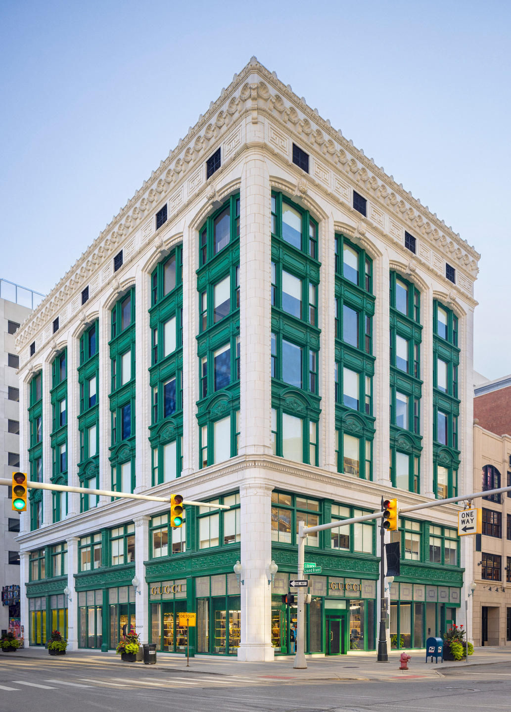 Though Gucci’s new storefront on Library Street will be its first brick-and-mortar establishment in Detroit, the brand and the city are already well acquainted. Gucci Changemakers North America, an initiative launched in March 2019, identified Detroit as one of its focus cities from the outset of the program, aiming to harness the city’s creativity to strengthen diversity, equity, and inclusion in the fashion industry. Design Core, a 2020 Changemaker grant recipient, stewards Detroit Month of Design and has been at the forefront of Detroit’s design community since 2010, contributing 3,000 new jobs to the city.