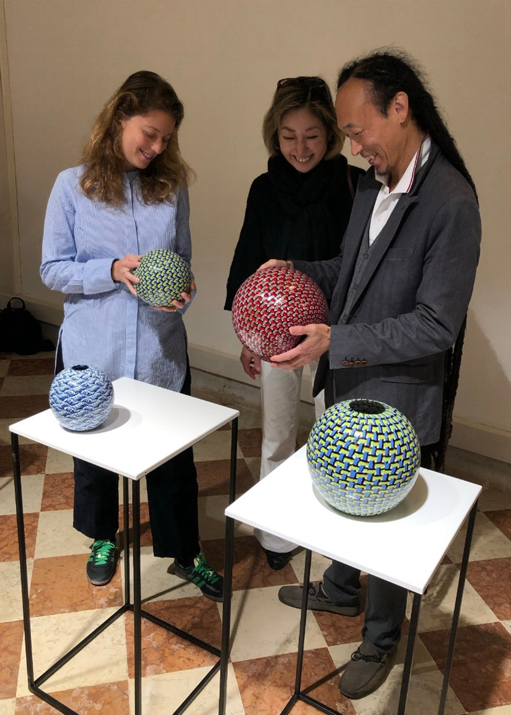There are many compelling projects being shown at the Venice Glass Week Hub—two buildings in Campo Santo Stefano where glassmakers and curators have been invited to create presentations. My favorite was the work of Akira Hara, organized by Sofia Zevi. Hara came to Venice from Japan in 1998 to study glass blowing and never left. He is highly respected on Murano and has a very distinctive way with the medium—he is a maestro at Seguso. The pieces he and Zevi showed were made using tesserae that had been arranged in intricate patterns based on graphics by the textile designer Chiarastella Cattana. The tesserae are configured flat on a tray, and then spun and blown into a vessel. Carlo Scarpa and Ercole Barovier used this technique too. The result here is incredibly fine and soulful.