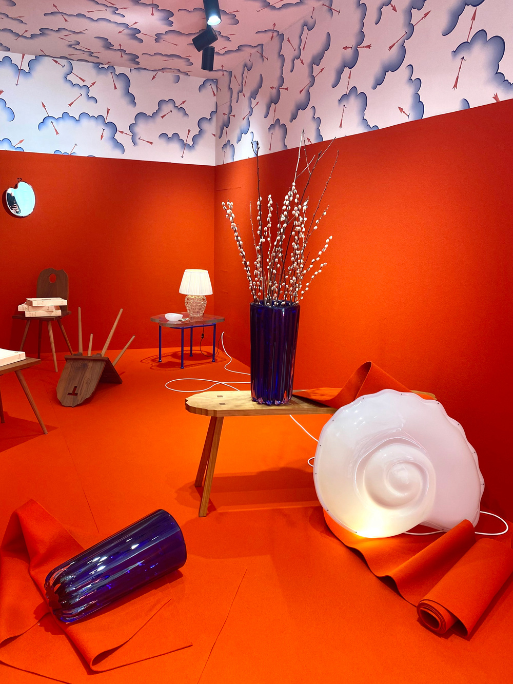 In April, my firm Charlap Hyman & Herrero collaborated with Yali, a celebrated glass studio in Venice, on an exhibition space called Free in Salizzada San Samuele. We lined the space in a brilliant reddish orange felt and a wallpaper design I made with my mother, Pilar Almon, for the textile company Schumacher. Inside, we staged various furniture and glass works by Yali, a paper cutout that I made, one of our plastic shell lamps, and a small palate-shaped mirror by Gio Ponti lent to us by Giorgio Mastinu—who has the most amazing little gallery in Venice around the corner. The skinny space is lit at night so people can walk by and view it through the window like a diorama. I love the way Yali’s shiny blue glass looks against the matte fire-colored felt.