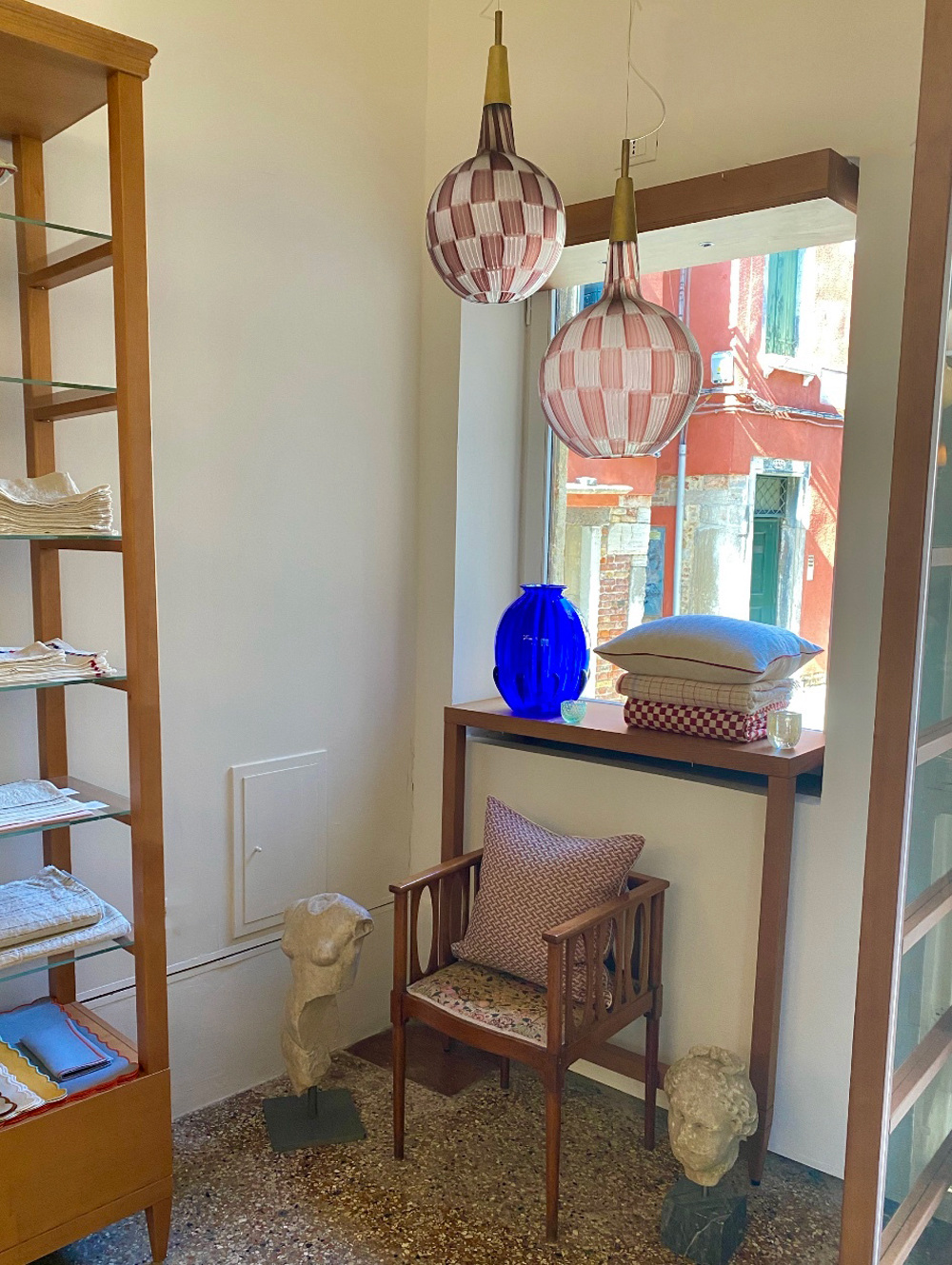 One of my favorite shops in Venice is Chiarastella Cattana—she creates extremely beautiful textiles for the home. This Glass Week she displayed lamps in her window by Tea Morosati, a designer who worked with the glass studio Barovier & Toso on Murano in 1955. There are not many women who have worked on Murano, so it was very special and illuminating to learn about her and see these glorious pink lamps. Everything in Stella’s shop is to die for—all the linens are the finest quality, handmade in the Dolomites on her designs. Fun!