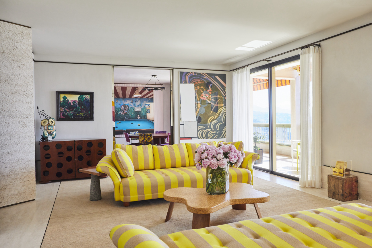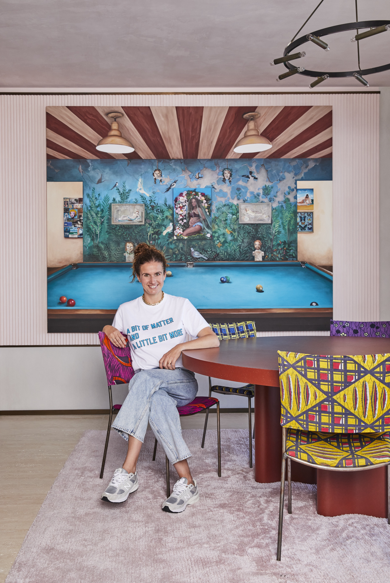 Emilie Pastor in her Monaco home. Artwork by Ana Elisa Egreja. Chairs by Franz West.