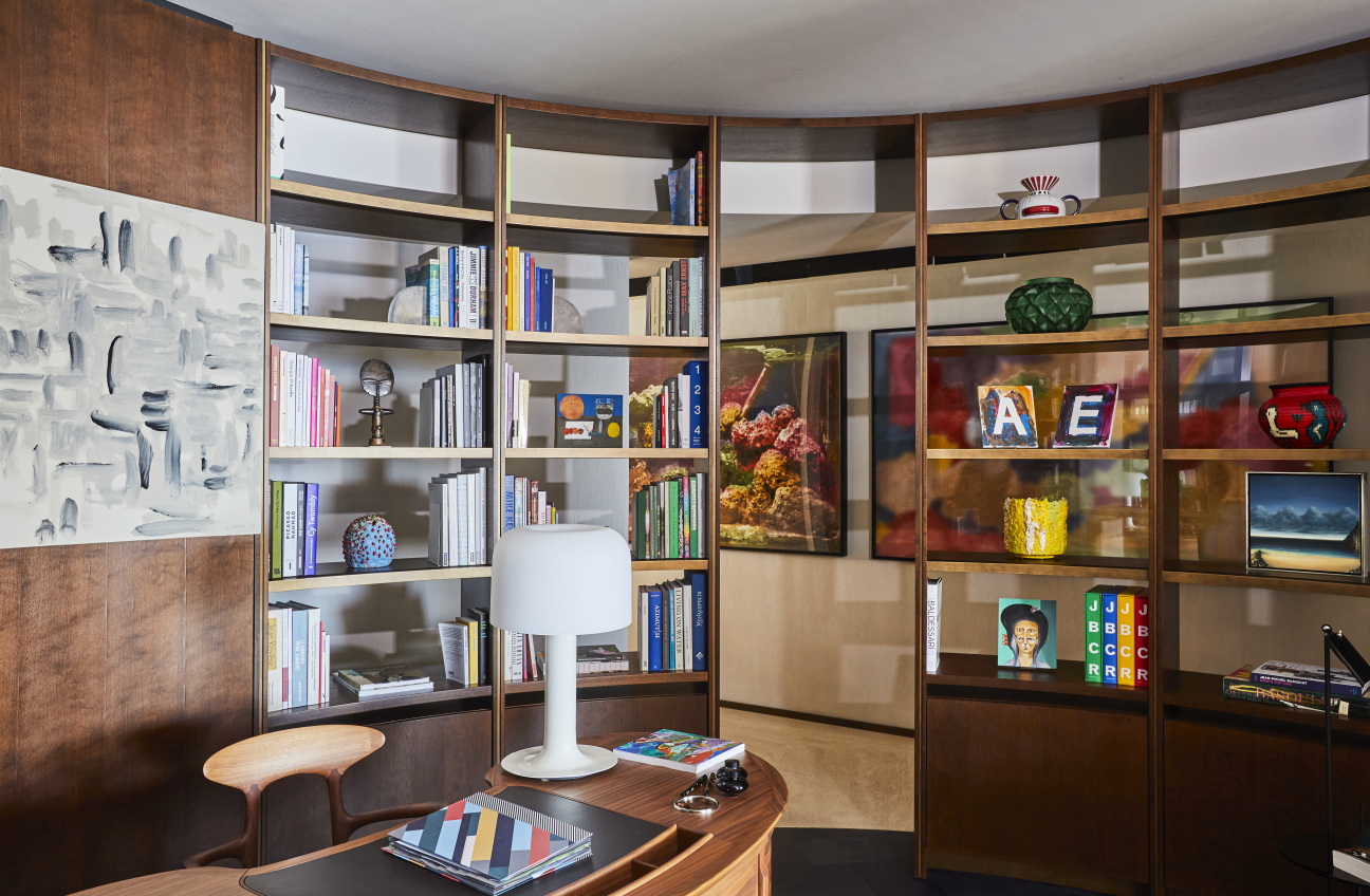 Artworks by Olivier Millagou, Claes Oldenburg and Coosje van Bruggen, Lee Ufan, Takuro Kuwata, Mike Kelley, Enzo Cucchi, and Dan McCarthy in the office.